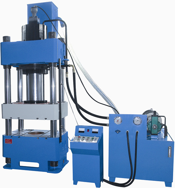 液壓機基本原理是油泵把液壓油輸送到集成插裝閥塊,通過各個單向閥和溢流閥把液壓油分配到油缸的上腔或者下腔,在高壓油的作用下,使油缸進行運動.液壓機是 利用液體來傳遞壓力的設備。液體在密閉的容器中傳遞壓力時是遵循帕斯卡定律。四柱液壓機的液壓傳動系統(tǒng)由動力機構(gòu)、控制機構(gòu)、執(zhí)行機構(gòu)、輔助機構(gòu)和工作介質(zhì)組成。動力機構(gòu)通常采用油泵作為動力機構(gòu),一般為積式油泵。為了滿足執(zhí)行機構(gòu)運動速度的要求, 選用一個油泵或多個油泵。低壓(油壓小于2.5MP)用齒輪泵;中壓(油壓小于6.3MP)用葉片泵;高壓(油壓小于32.0MP)用柱塞泵。各種可塑性 材料的壓力加工和成形,如不銹鋼板的擠壓、彎曲、拉深及金屬零件的冷壓成形,同時亦可用于粉末制品、砂輪、膠木、樹脂熱固性制品的壓制。
